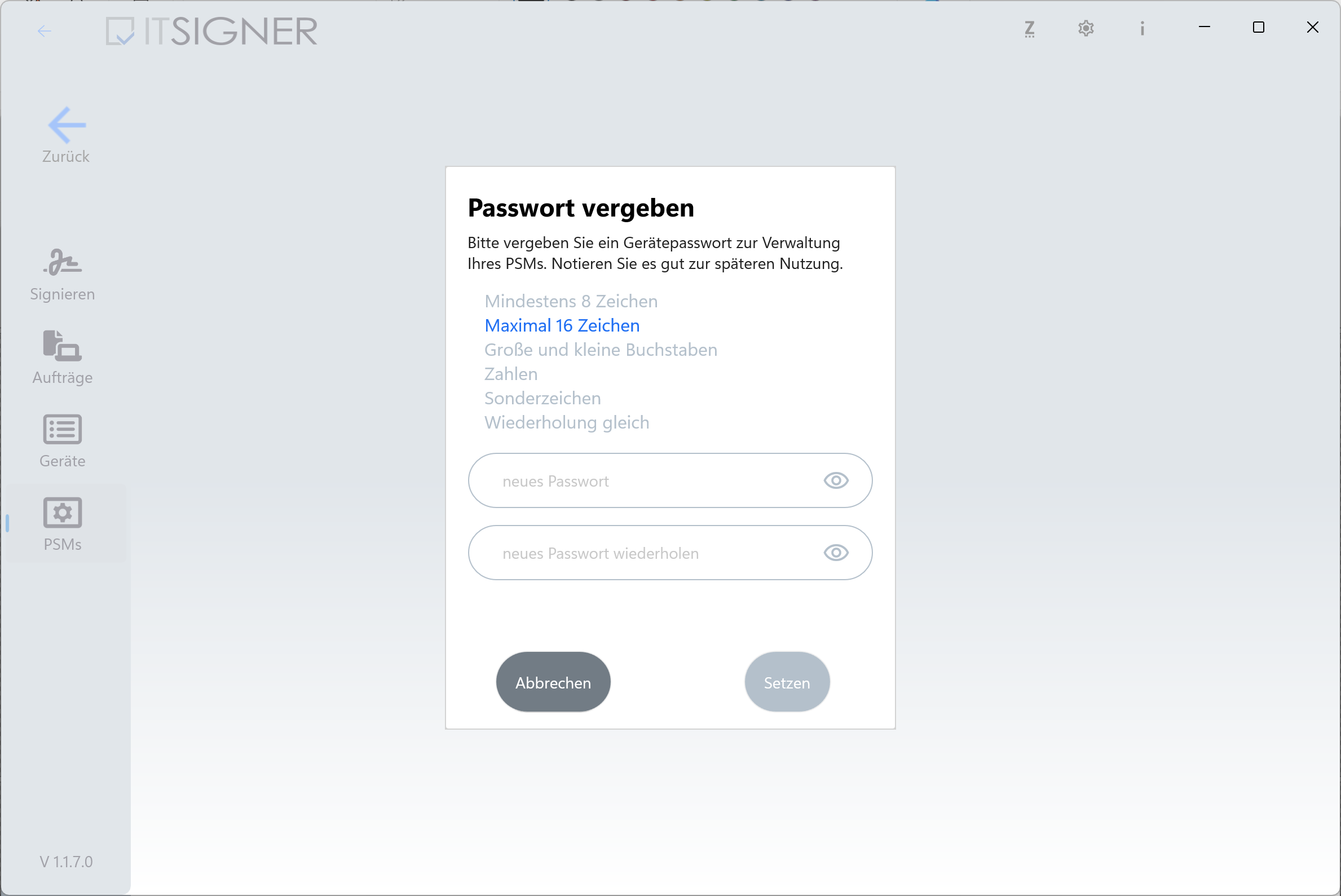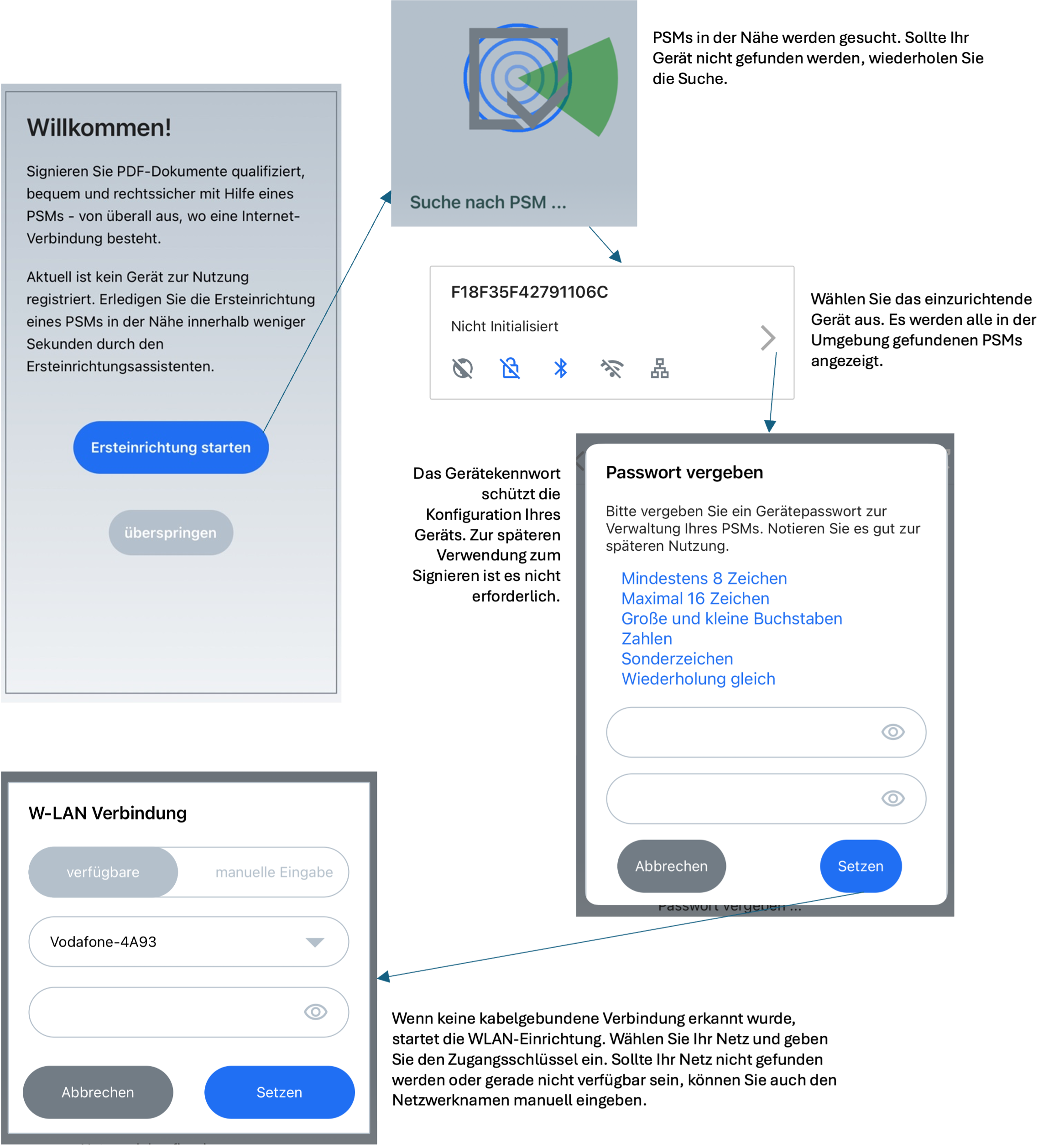 Lors du premier démarrage de l’application, des autorisations pour l’accès Bluetooth et la recherche d’appareils sur le réseau local peuvent être demandées. Autorisez l’accès pour permettre la configuration du PSM. Un assistant guide ensuite à travers la configuration tant qu’aucun périphérique de signature n’a été attribué.